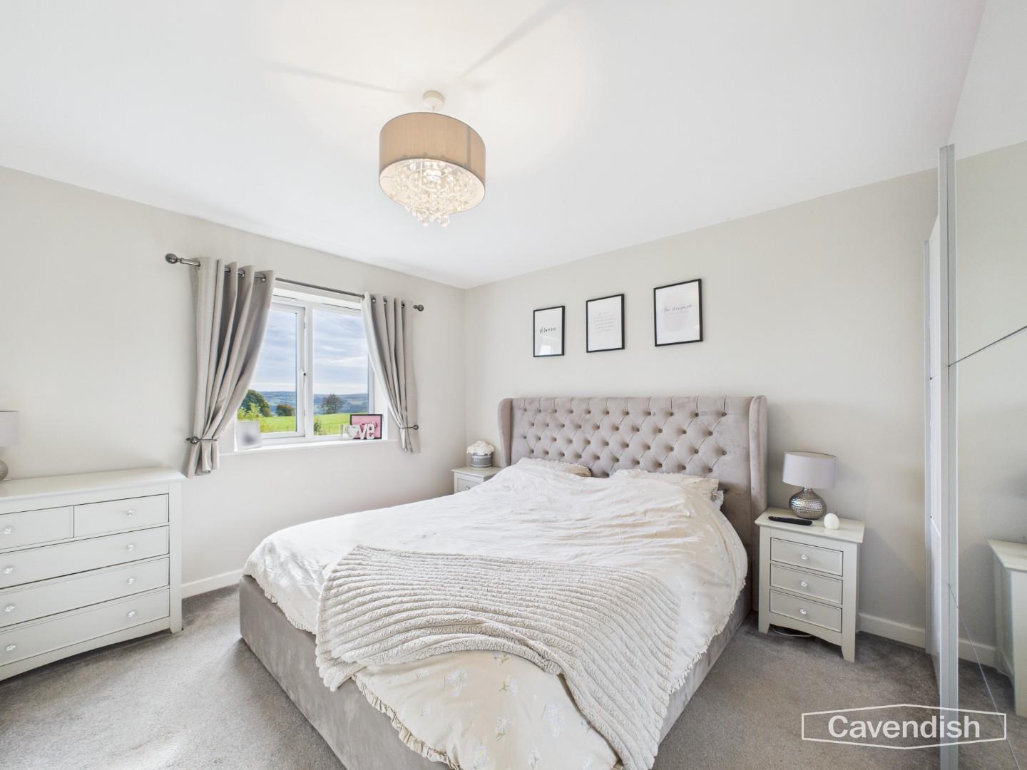 A spacious double bedroom with grey carpet, and a rear-facing window overlooking the garden and surrounding views.