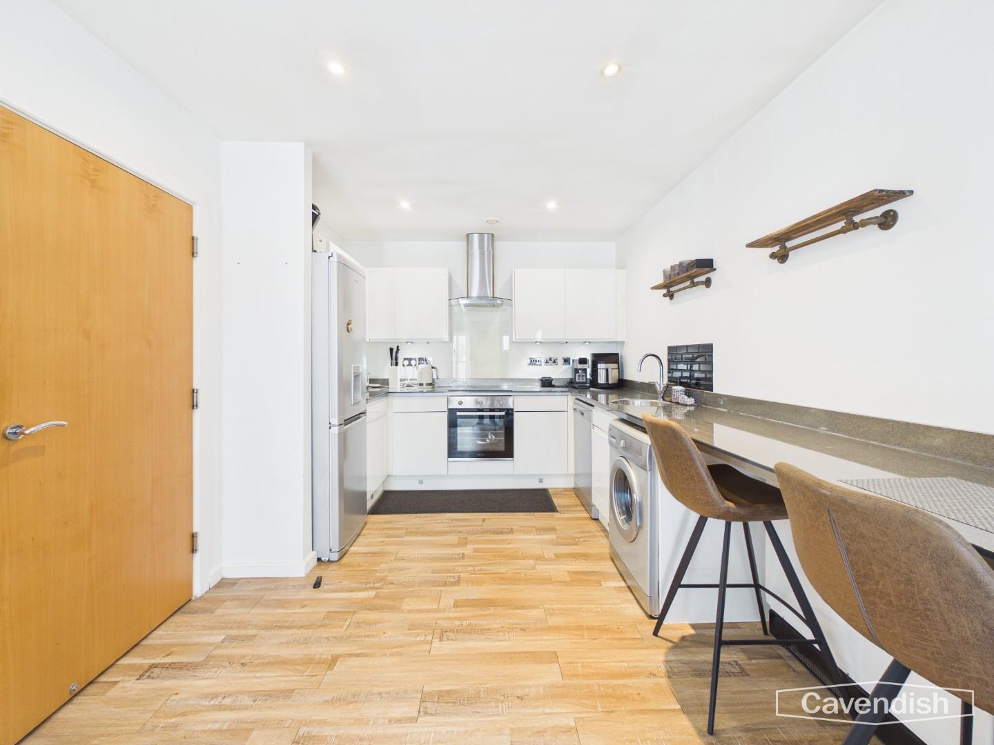 Fitted with a modern range of white high gloss fronted base and wall level units incorporating drawers and cupboards with laminated worktops incorporating a breakfast bar area. Inset single bowl stainless steel sink unit with chrome mixer tap. Fitted four ring touch control ceramic hob with glass splashback, extractor above and built-in electric fan assisted oven and grill. Plumbing and space for washing machine and dishwasher, space for tall fridge/freezer, LED kickboard lighting, vinyl wood effect flooring, electric storage heater, recessed LED ceiling spotlights, ceiling extractor, and under-cupboard lighting.
