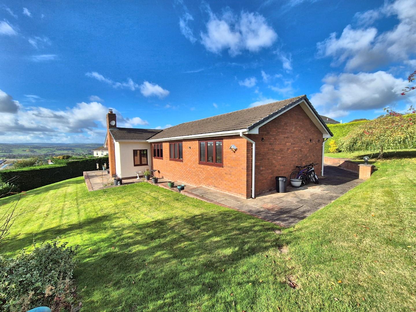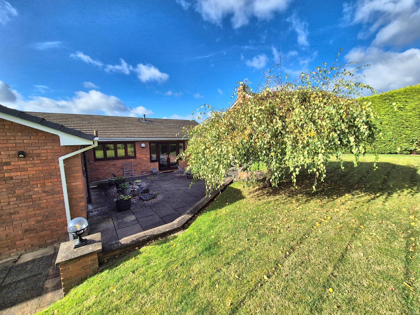 A HIGHLY APPOINTED THREE/FOUR BEDROOM DETACHED BUNGALOW of individual design standing within large and beautifully landscaped gardens in a large corner plot to an elevated position commanding far reaching views across the vale towards Ruthin and beyond. Standing at the head of a highly regarded residential cul de sac, the spacious bungalow offers elegant and versatile accommodation with recessed entrance, large reception hall which opens to a long inner hall, 20′ x 13′ lounge with picture windows affording south and westerly views, dining room/occasional bedroom four, luxury fitted kitchen and dining room with range of Neff appliances and French doors opening to the rear garden, side hall, refurbished utility room and cloakroom with WC. Bedroom one with a range of fitted wardrobes and en suite. Two further bedrooms and newly refurbished luxury bathroom.House alarm system, Double glazing, oil c.h.. Large integral double garage together with extensive tarmacadam parking with electric vehicle charging point. Wide sweeping lawns to both front, rear and one side together with extensive patios and mature hedging.