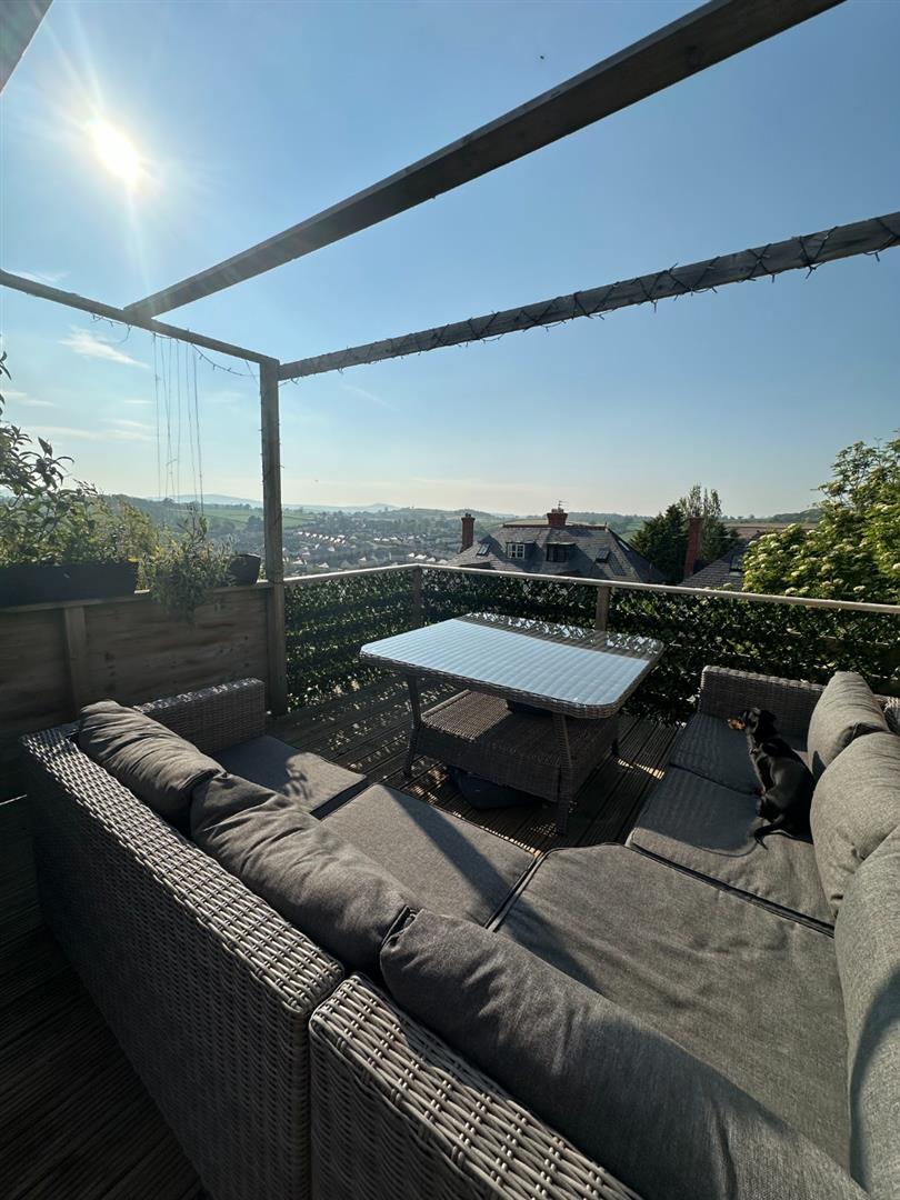 To the rear is a long rectangular shaped lawned garden which has been landscaped with an elevated decked patio taking full advantage of the views over the town and across to the Vale of Clwyd and surrounding hillside. Outside taps and light.