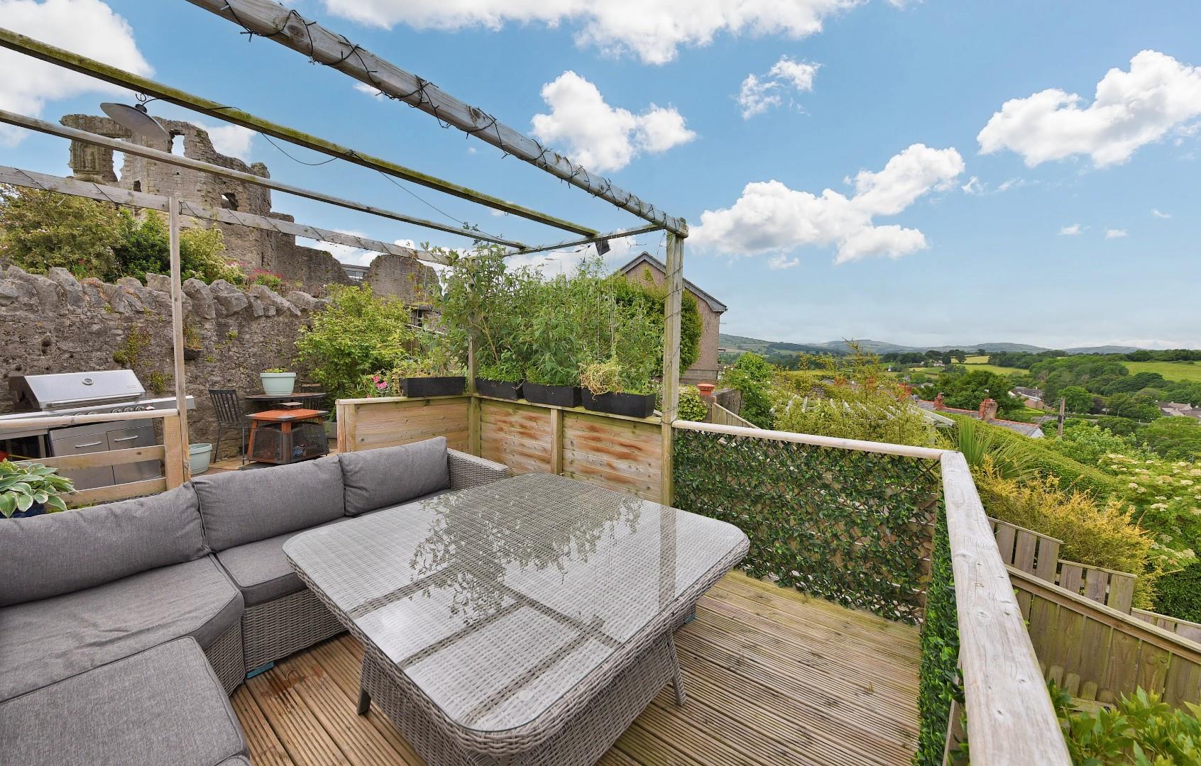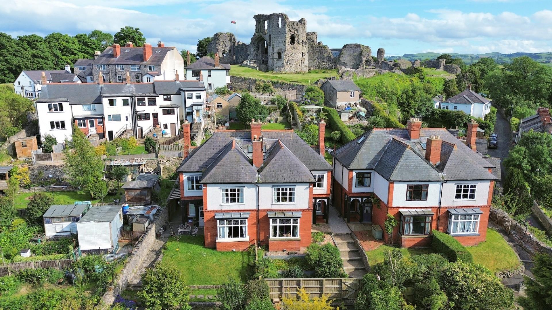 Occupying a superb elevated position below Denbigh Castle with far reaching views over the town and across to surrounding countryside, a distinctive and well appointed four bedroom semi-detached period house with garage, established gardens and elevated decked patio. Affording an appealing family home over three floors with many original character features whilst combining modern fittings. Including stained leaded glass, features fireplaces with multi-fuel stoves, original pitch pine staircase and stripped pine interior doors. In brief comprising; entrance porch, reception hall, lounge with bay window, open plan kitchen/dining/family room with modern range of units with granite worktops, utility room, rear porch with two useful stores and outside WC. First floor landing, three double bedrooms, well appointed family bathroom and box room. Second floor landing; floor fourth bedroom with en-suite cloakroom. Attractive gardens to front and rear with elevated decked patio/BBQ area taking full advantage of the setting and far reaching views. Gas central heating.