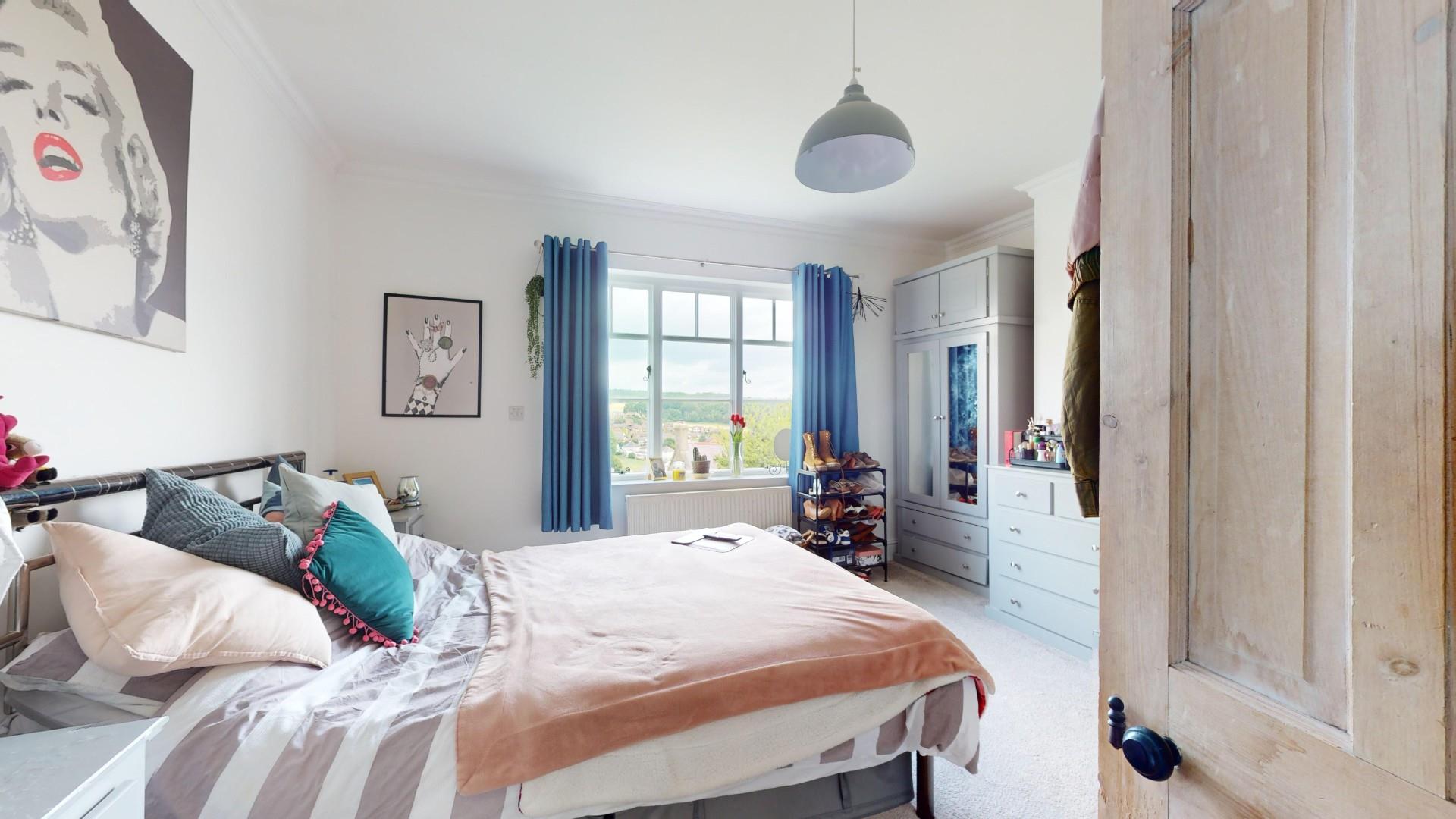 Window to the front elevation with superb views over the surrounding area, exposed floorboards and radiator.