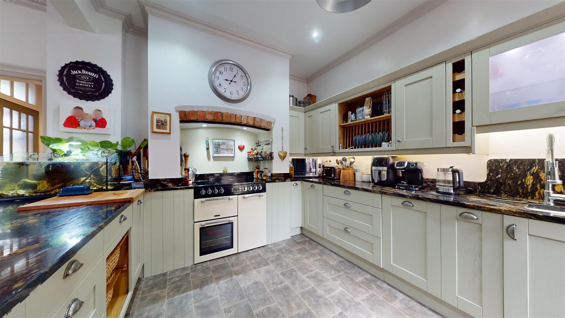 A spacious open plan room fitted with an attractive range of 'duck egg' coloured wood grained fronted base and wall level units with a dividing peninsula unit and solid granite work surfaces with inset enamelled sink unit with preparation bowl and mixer tap. Matching up-stands, under cupboard lighting, plate rack and a recess for an electric range style cooker (available by separate negotiation). Integrated dishwasher, recessed ceiling lighting, exposed floorboards to the dining/family area, single glazed windows to two aspects and fireplace with tiled hearth and multi-fuel stove. Traditional style radiator and pine door to the Utility Room.