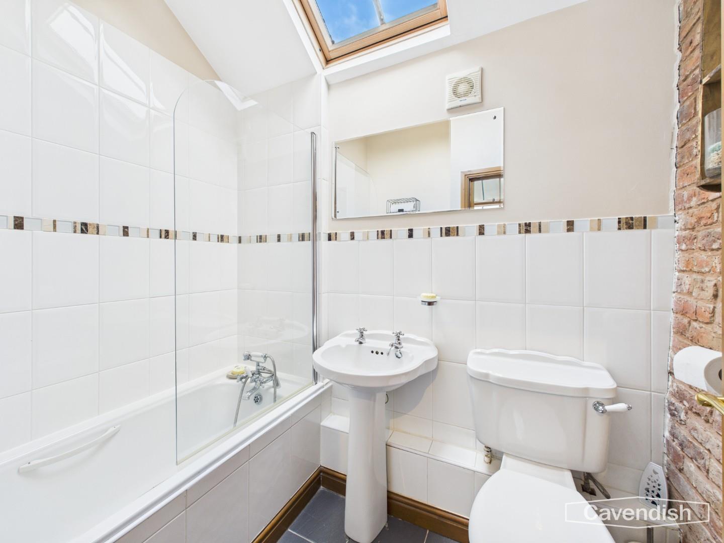 White suite with chrome style fittings comprising: panelled bath with mixer tap and shower attachment and glazed shower screen; low level WC; and pedestal wash hand basin. Part-tiled walls, fitted wall mirror, feature exposed brick wall, exposed timber, ceiling light point, extractor, tiled floor, and double glazed Velux roof light.