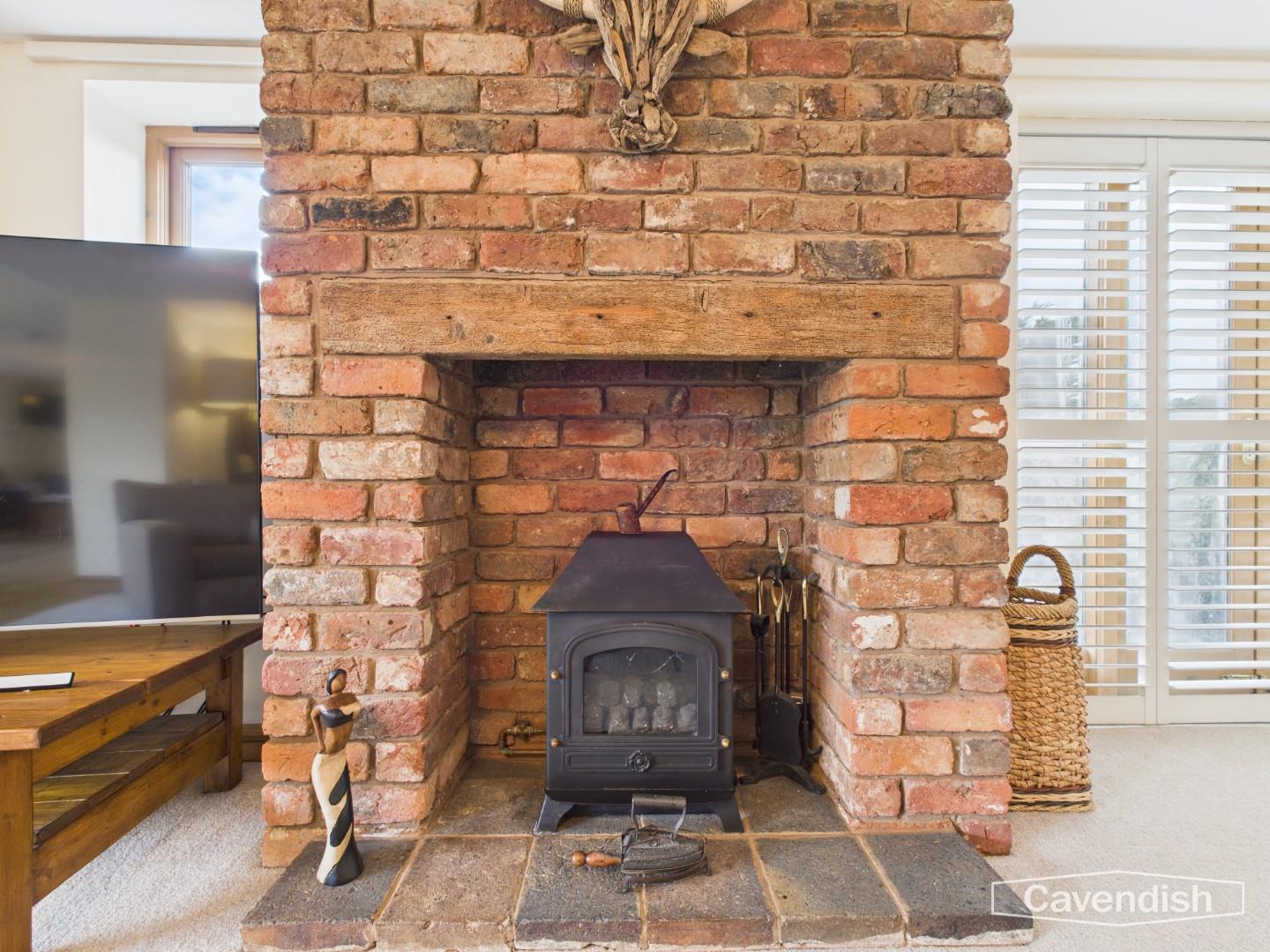 Decorative brick fireplace with quarry tiled hearth housing a cast-iron coal-effect burner, double glazed window, double opening French doors to the garden with shutters, exposed timbers, two ceiling light points with dimmer switch controls, telephone master socket, two double radiators with thermostats, and Hive central heating and hot water controls.