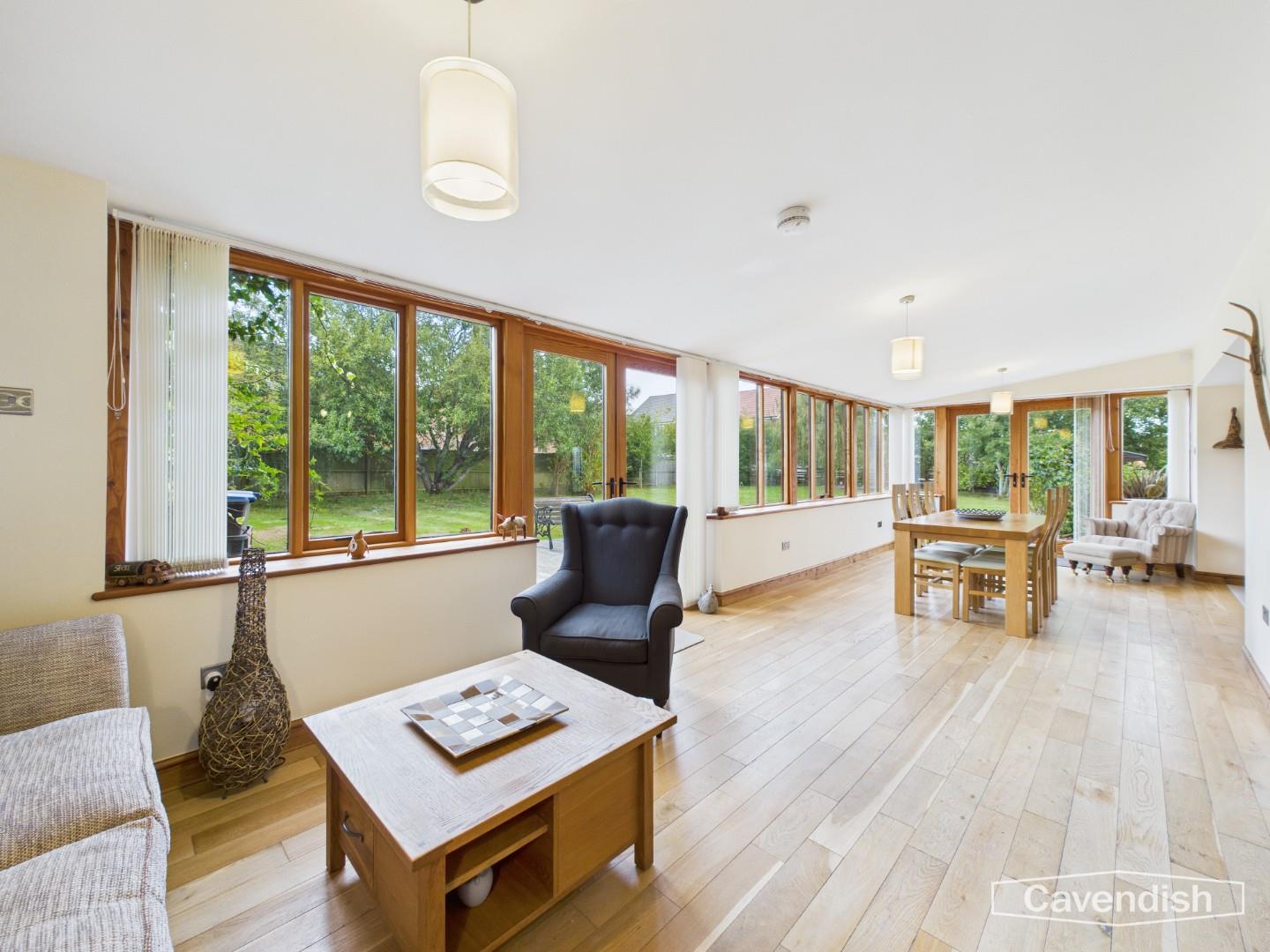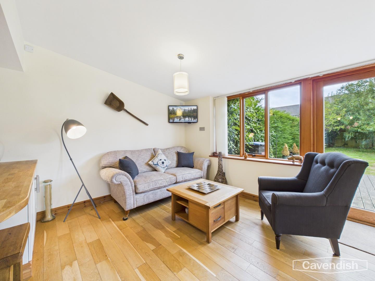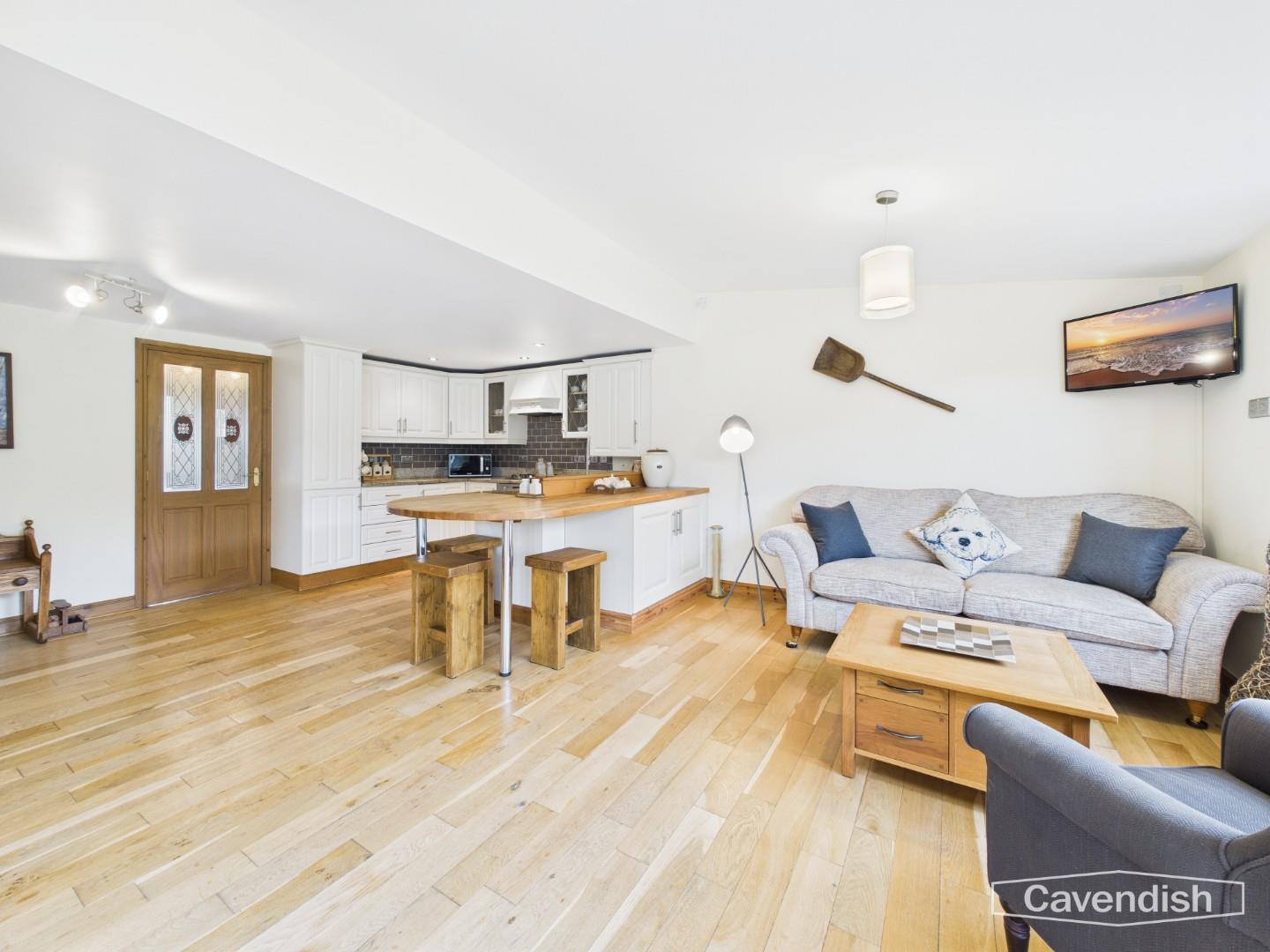 A large reception area enjoying double glazed windows overlooking the garden and two sets of French doors to outside, oak wood strip flooring, three ceiling light points, provision for wall mounted flat screen television, and mains connected smoke alarm. Wide opening to the living room.