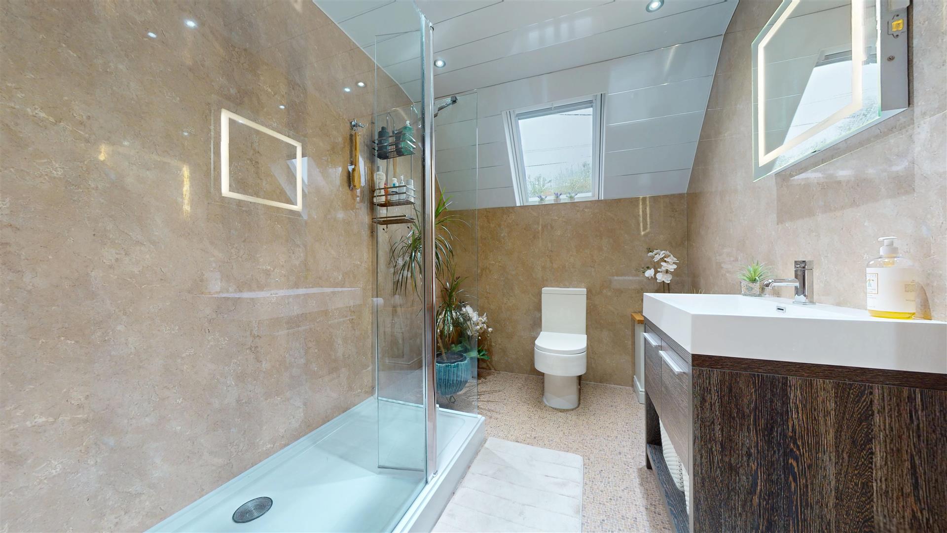 Luxury en suite shower room recently refurbished with a large walk-in shower with glazed screen and high output shower, modern vanity with deep basin, pillar tap and storage cabinet, low level WC, partially vaulted ceiling with walls clad in marble effect wall board together with clad ceiling with downlighters, Velux roof light, stainless steel and enamel towel radiator.
