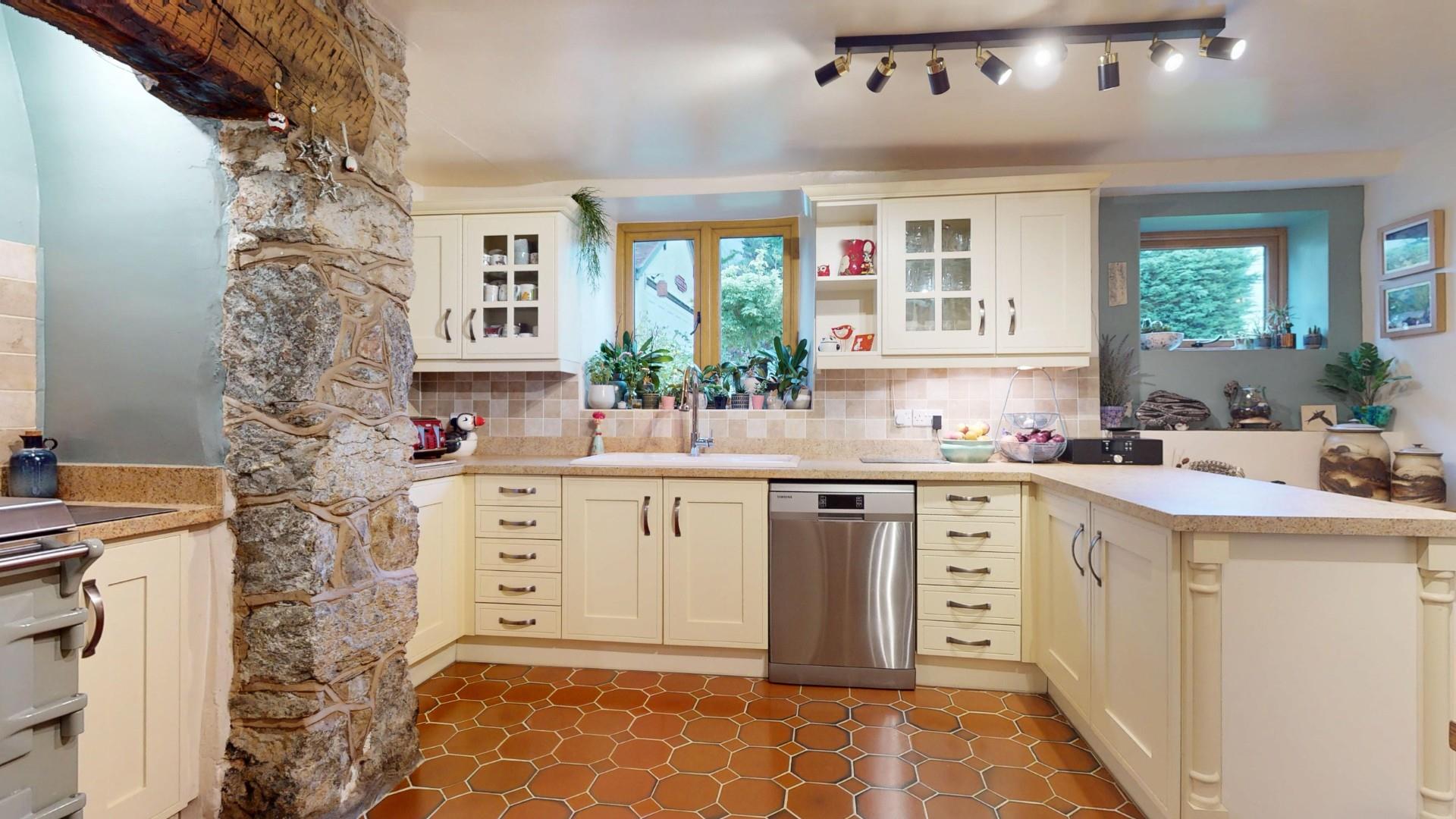 Stone faced inglenook style fireplace housing "Ever Hot" range with large twin hot plates and oven. Samsung extractor hood and light above, attractive octagonal shaped floor tiling, double glazed window, panelled radiator. The kitchen leads through to the day lounge.