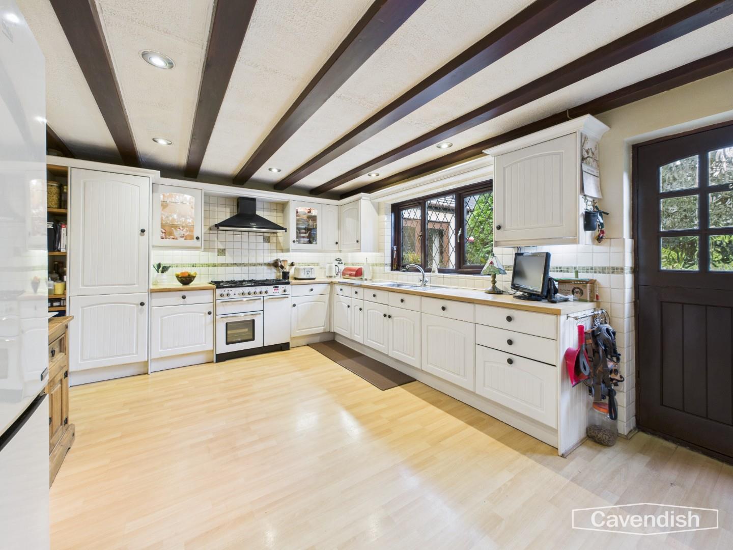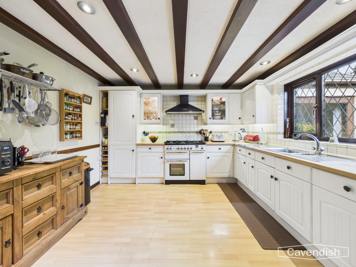 Fitted with a range of Shaker style units incorporating drawers, cupboards, and two glazed cabinets with display lighting and laminated wood effect worktops. Inset one and half bowl stainless steel sink unit and drainer with mixer tap. Wall tiling to work surface areas with concealed under-cupboard lighting. Free standing Range Master Toledo + range style cooker with five-ring gas hob, double oven and grill. Integrated Bosch dishwasher. Double radiator with thermostat, beamed ceiling with recessed ceiling spotlights, laminate wood strip flooring, UPVC double glazed leaded window overlooking the rear garden, and part-glazed stable type door to outside. Door to utility area.