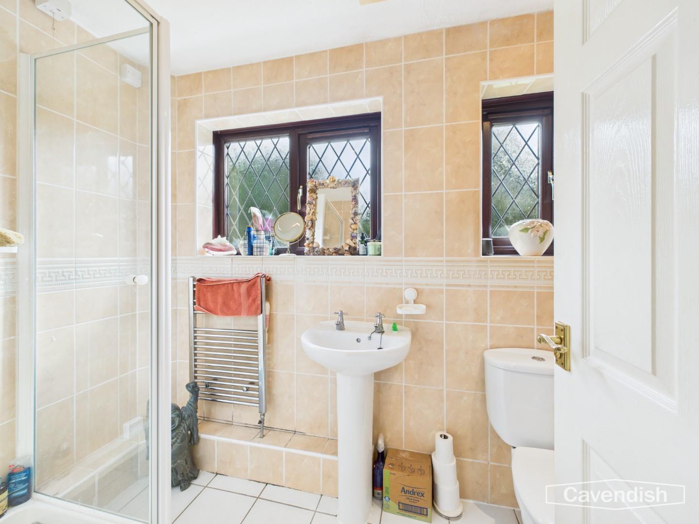 White suite comprising: tiled shower enclosure with Heat Store electric shower, glazed shower screen and glazed door; pedestal wash hand basin; and low level dual-flush WC. Fully tiled walls, tiled floor, chrome ladder style towel radiator, recessed ceiling spotlights, extractor, and two UPVC double glazed windows with obscured leaded glass.