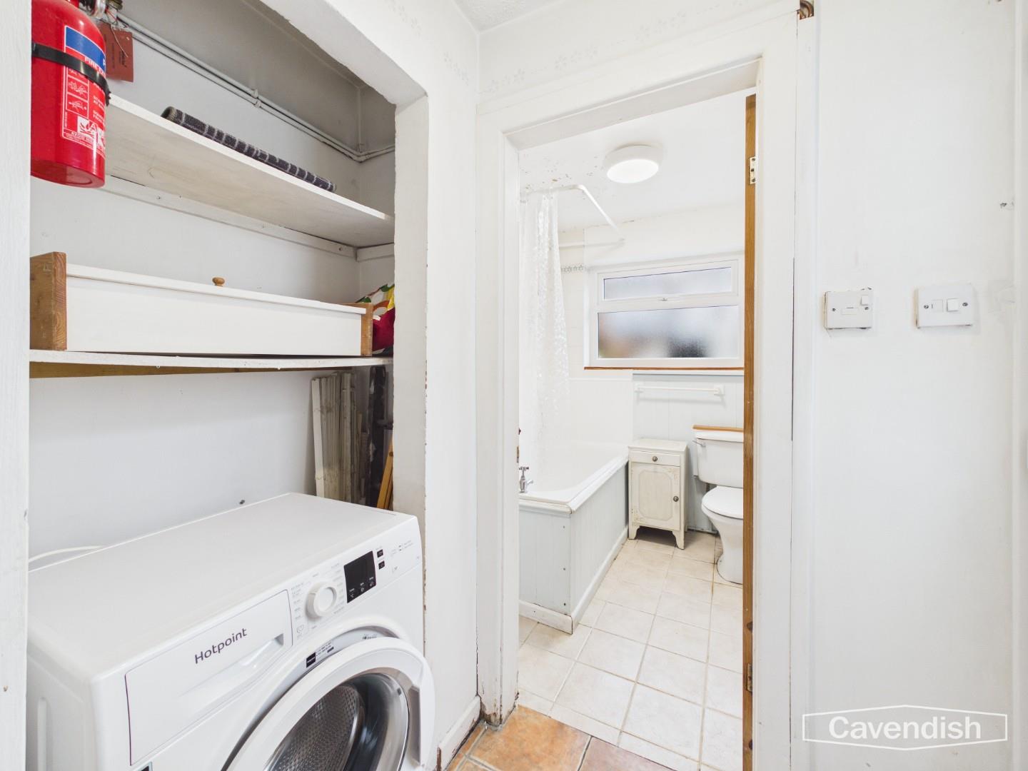 Ceiling light point, plumbing for washing machine, fitted shelving, tiled floor, and UPVC double glazed door to outside. Door to bathroom.